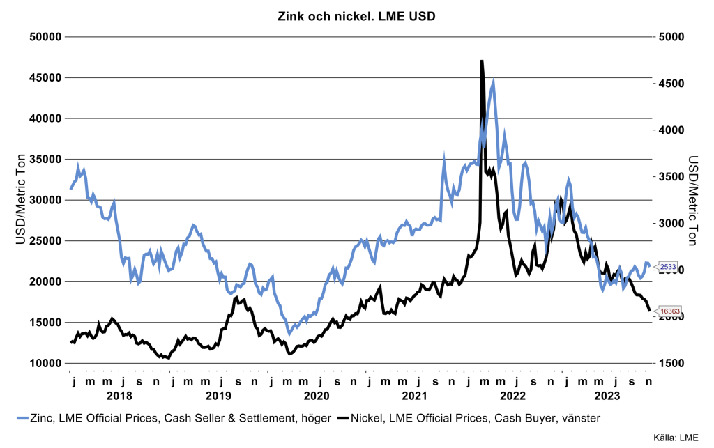 — Priset på Nickel och Zink har minskat i mycket hög omfattning sedan Ukrainakriget inleddes. Ni inte långt ifrån samma nivå som under högkonjunkturen 2018–2019, Zn klart lägre både räknat i USD. Visserligen har global fordonsindustri kommit tillbaka efter en period av komponentstörningar men produktionsvolymerna har ännu inte nått upp till nivåerna från 2018/2019. Därutöver har efterfrågan på rostfritt från vitvaru- och livsmedelsindustrin minskat som följd av hushållens minskade slutefterfrågan på dessa varor är på eller lägre, förklarar Bengt Lindqvist.