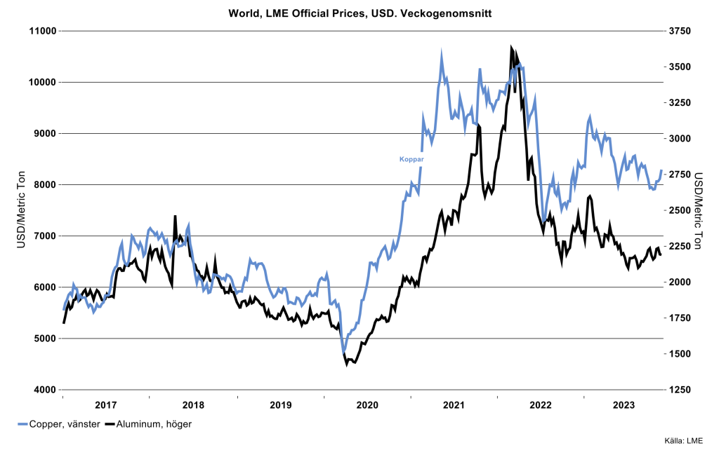 Jämfört med 2022 har koppar- och aluminiumpriser uppvisat betydande fluktuationer, delvis drivna av förändringar i Kinas ekonomiska politik och globala investeringstrender. Både aluminium (Alu) och koppar (CU) nådde en topp i samband med Rysslands invasion av Ukraina, för att därefter falla tillbaka. När Kina ändrade sin pandemipolicy förra året vid den här tidpunkten kom en kortvarig prisuppgång då Kinas ekonomiska tillväxt tog fart. Därefter har Kinas ekonomi tappat tempo och världsmarknadspriserna fallit tillbaka.